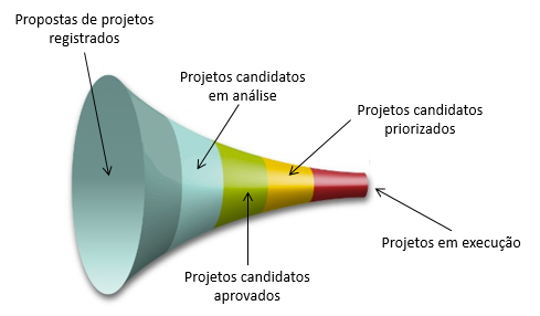 O PMO é o órgão da empresa responsável por auxiliar na definição de quais projetos devem ser feitos ou não. Sendo assim ter, ter a figura de um funil que indique a situação dos projetos é algo de grande valor. A figura a seguir mostra um funil hipotético de projetos. Lógico que a ideia não é apenas mostrar o funil. É necessário que, ao apresentar o funil, haja acesso ao banco de dados com informações dos projetos em cada um dos estágios do funil.