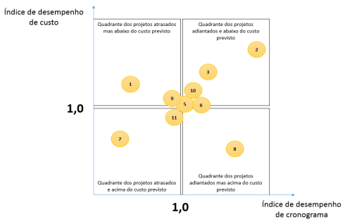 A figura a seguir mostra o exemplo de um gráfico de situação do portfólio de projetos. Observe que a maior parte dos projetos está em dia e dentro do custo previsto. O projeto 7 é o que está em pior situação (Atrasado e acima do custo). Já o projeto 2 é o que está em melhor situação (Adiantado e abaixo do custo).